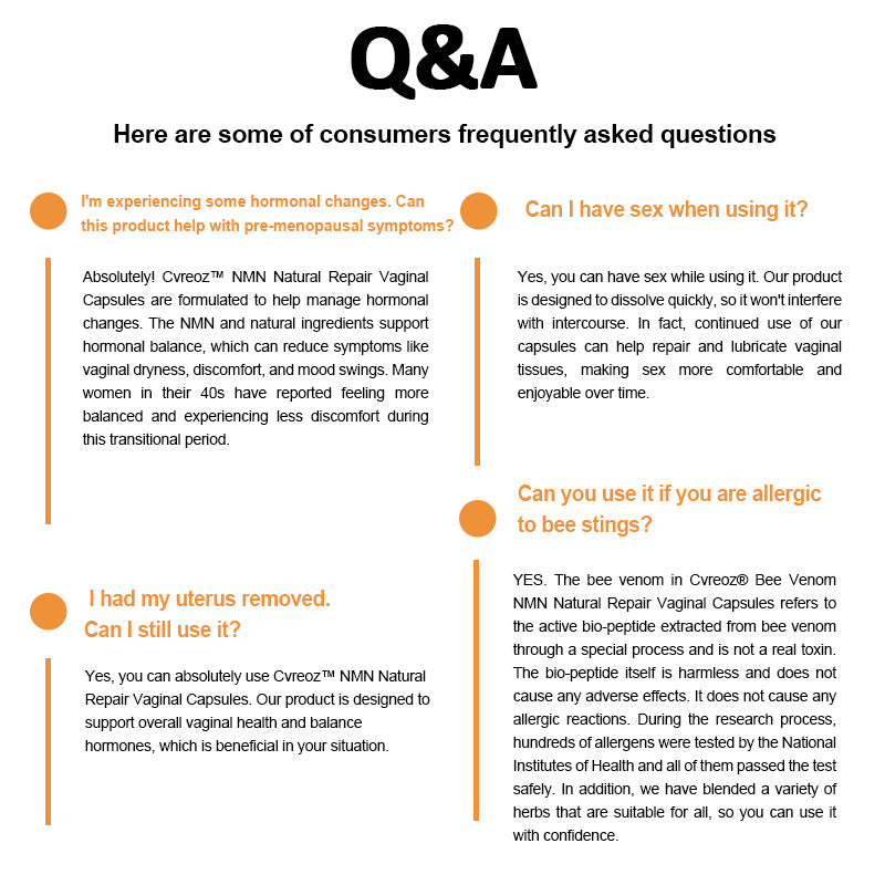 Extensive research shows that these ingredients work synergistically to balance hormones, reduce inflammation, enhance metabolism, and maintain overall health. Cvreoz® Bee Venom NMN Natural Repair Vaginal Capsules combine them in a scientifically formulated blend, providing a comprehensive approach to women's health. Each ingredient is backed by scientific evidence, ensuring the product's efficacy and safety, which users can trust.